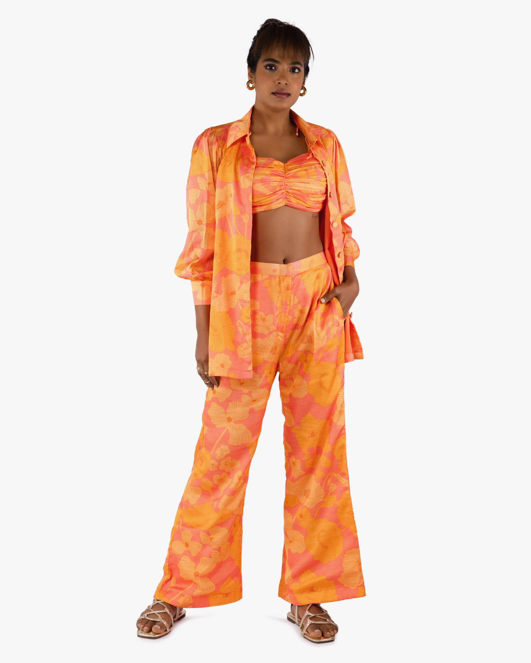 DESCRIPTION OF THE OUTFIT – Embrace the ethereal beauty of dusk with the sunset Co-ord set/pant/shirt/ crop top, which exudes elegance and style, capturing the mesmerizing hues of a vibrant sunset. Blending warm tones of burnt orange, gold, yellow, and soft pinks, this ensemble radiates timeless charm, making every moment a picture-perfect memory against the backdrop of nature's most captivating display. Crafted from luxurious fabric, its flowing silhouette and fine details evoke a sense of comfort, ensuring you stand out with grace and fashionable flair.