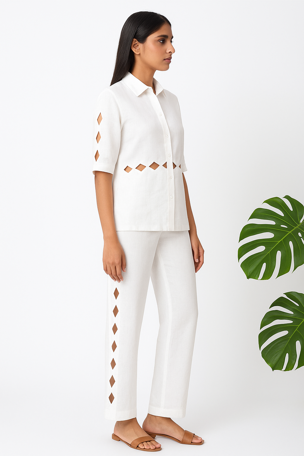 The shirt features a slightly elongated button-down silhouette with half sleeves, designed with precision cutwork accents — a single vertical diamond cutwork along the sleeve and a bold diamond cutwork at the waist, offering a glimpse of skin while keeping the look sophisticated. The trousers balance the set with a high-waisted fit and straight-leg cut, refined by a line of vertical diamond cutwork tracing the outer side seams, creating length and visual interest.